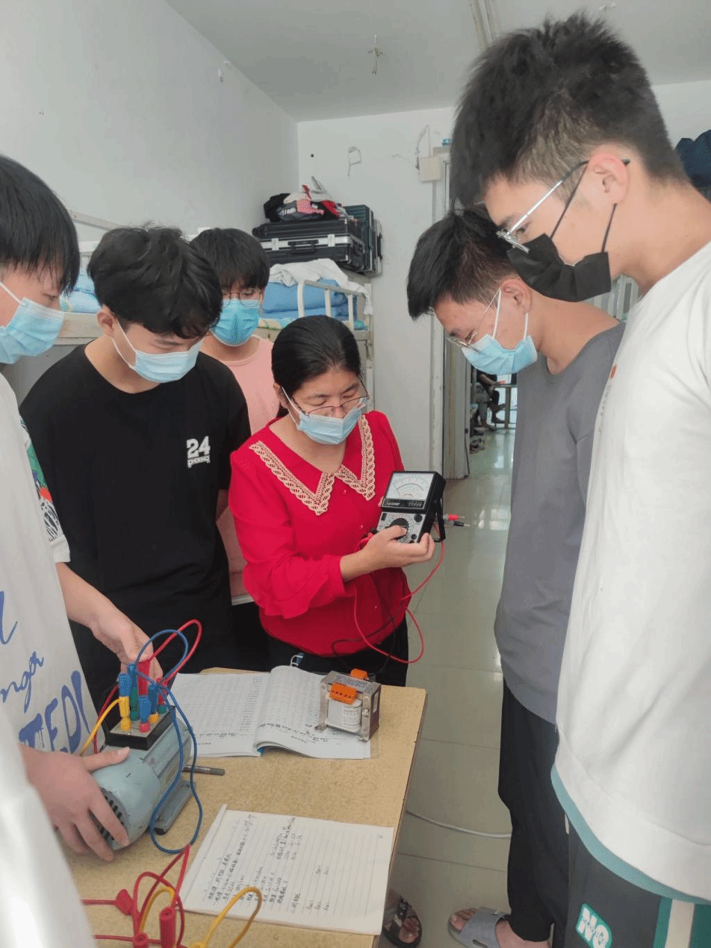 智能制造学院安丽红老师把教具和实训设备搬进宿舍,采取现场授课的方式,弥补了网课学生不能动手操作的不足。她以宿舍为单位细化任务,有的宿舍带着疑问观看录播视频绘制图纸,有的宿舍观看教师演示视频记录操作要点,有的宿舍领取检测元器件现场接线调试,老师在巡回指导中及时发现问题,为学生答疑解惑,最大程度还原了线下上课的效果。