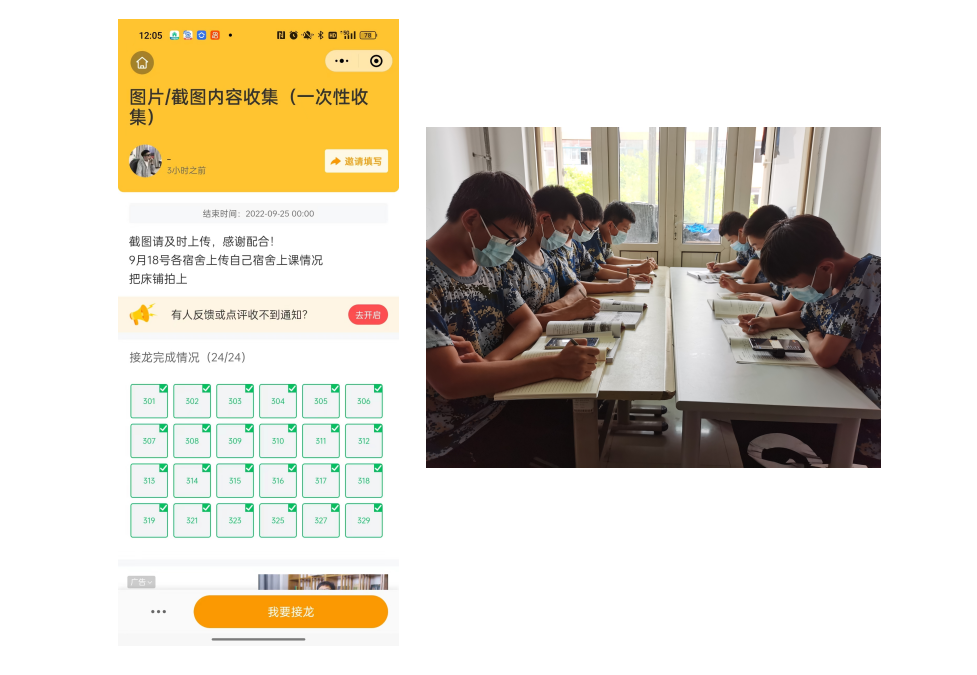 汽车技术学院利用信息化督导手段,按照楼层建立舍长群,每日两次用微信接龙小程序收集学生上课照片,有效快速整顿课堂秩序。张富坤老师走进实训室进行现场直播,熟悉的实训室场景把学生瞬间带回到线下上课的情景,激发了学生的学习兴趣。