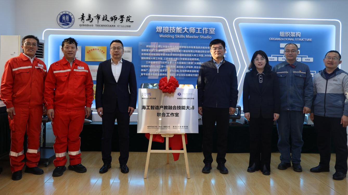 座谈会上,韩东对刘中民一行表示欢迎,并介绍了学院在校企协同育人、焊接技能提升培训等方面的实践成果。他表示学院将重点做好服务企业的工作,通过项目化运行相关领域的合作,通过校企融合将企业生产任务与前沿技术研发紧密结合,共同培养焊接高技能人才。刘中民高度评价了学院的办学成果与人才培养质量,介绍了海洋石油工程(青岛)有限公司对焊接技术高技能人才需求情况,并表达了明确的合作意愿。希望双方能在校企协同育人、焊接人才培养等领域达成深度合作,实现精准对接、优势互补、互利共赢。在双方的共同见证下,“海工智造产教融合技能大师联合工作室”顺利揭牌。