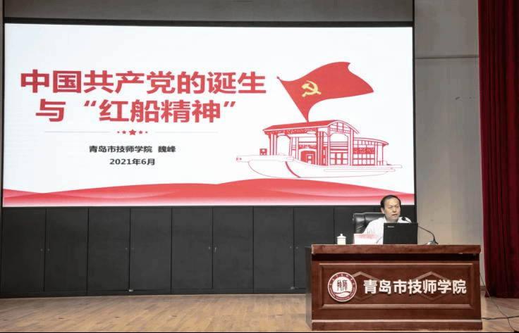 为庆祝中国共产党成立100周年,深入推进党史学习教育走深走实,根据学院党史学习教育工作安排,6月4日下午,学院党委委员、副院长魏峰同志在即墨校区报告厅以《中国共产党的诞生与“红船精神”》为题讲授专题党课。学院领导、全体中层干部、党员参加。