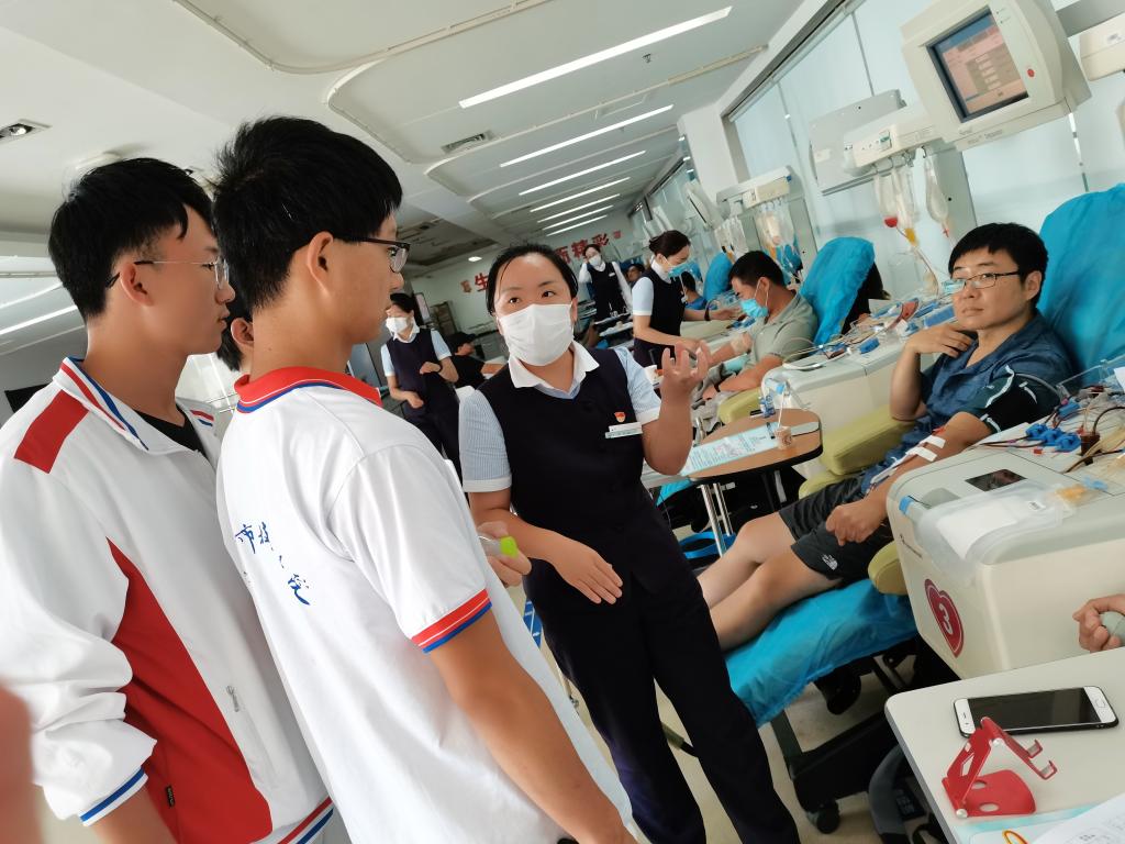 座谈会后,同学们在工作人员的带领下参观了青岛市中心血站供血科和机采大厅。在供血科,同学们近距离观察了检测合格的成品血液,知道了不同血液成分有不同的储存条件要求,了解了血液的储存、发放过程,大家对“一袋血的全旅程”有了更深刻的体会,也对无偿献血产生了更浓厚的兴趣。参观的最后一站是机采大厅,工作人员向同学们介绍了整个献血流程,从征询、填表、快检到成功采集,边听边看,同学们有了更直观的体会,血小板的采集是同学们之前没有听说过的,在机采大厅看到只在生物课本上出现过的“血小板”,5名同学毅然决定每人捐献400毫升全血。