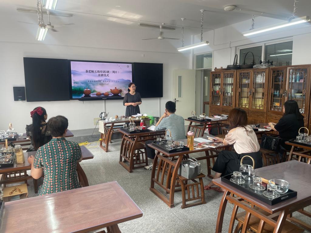 6月19日,由培训部和青岛市茶文化研究会联合举办的茶艺师五级培训,在青岛市技师学院市北校区开班授课。