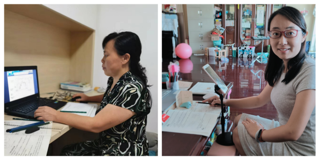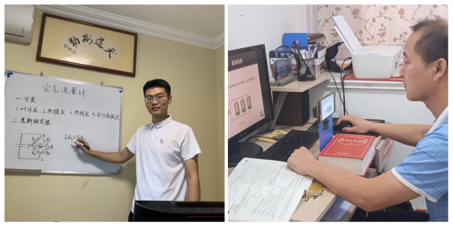 张文瀚老师居家专门准备了白板,书写板书,确保学生在线掌握重难点内容。身处封控区域的王冠军老师克服网络不佳问题,选用手机+电脑联合直播的形式确保不间断线上课堂。