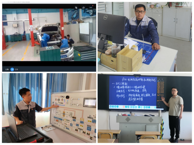 王亮老师在讲授汽车钣金课程时,充分利用实训车辆,现场拆装车身部件,对汽车的前保险杠、翼子板等部件拆卸调整,边操作边讲解。崔阳阳老师通过融入思政元素,将电路图分析与自我剖析相结合,7S管理理念与体会父母不易相结合,故障诊断与团队合作相结合,通过思政课程和专业相结合提高学生专业文化、职业操守、思想认识。张富坤老师用新能源汽车实训面板,讲授混合动力汽车的分类,以动力传输演示,跟同学们互动,引起学生的学习兴趣。单玉东老师为方便与学生互动,积极利用智慧黑板在教室给学生上课。