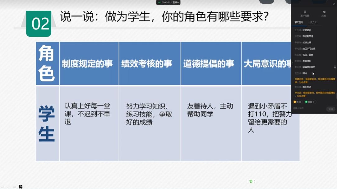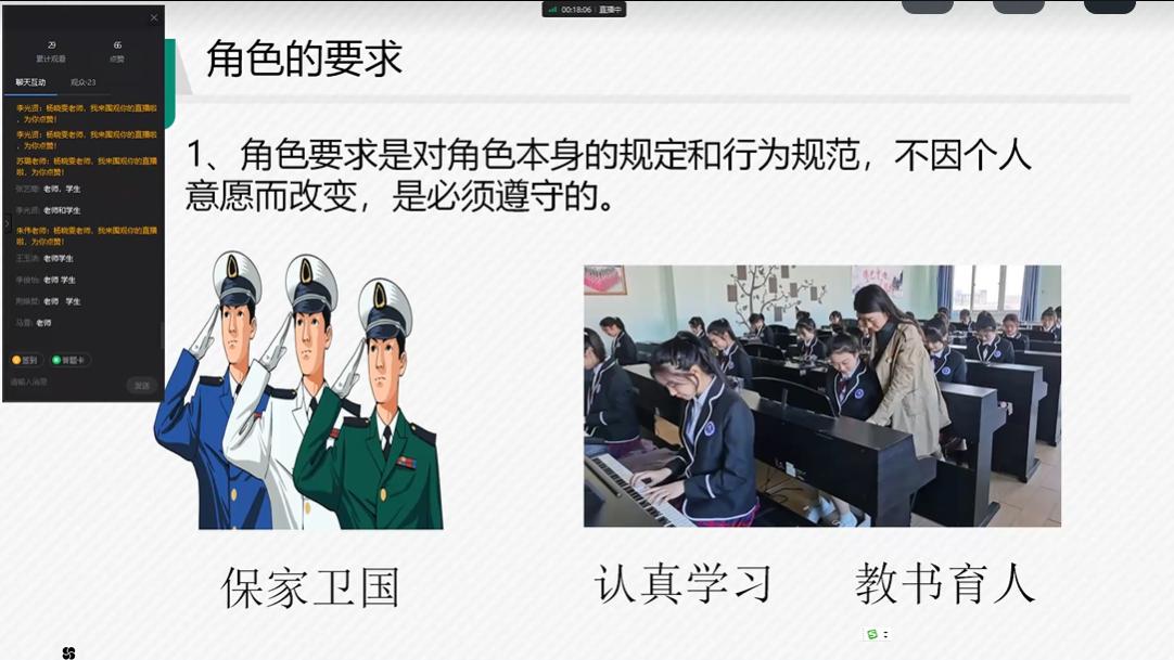 各教研室按照部门的公开课总体安排有序开展。本周素养教研室的杨晓雯老师为大家带来了主题为《角色要求与责任》的公开课。