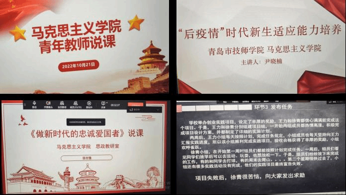 本次教研活动由来自核心素养教研室和思政教研室的四位青年教师进行了说课展示。在整个教研活动过程中,四位老师主要围绕“教什么、怎么教”来展开自己的说课内容。其中,鲁大超老师的课程围绕和运用一体化教学方式,让学生在做中学、学中做,通过任务的发布与解决来培养学生的思考能力和团队合作能力;辛红老师运用三段式教学法开展教学,指导学生在看中学、问中学、诘中学、动中学的过程中认识自律,提升自律能力;任付张老师将课程内容与学生专业特色相联系,培养学生的职业能力与爱国热情;尹晓楠老师运用案例教学法,将“后疫情时代”适应能力的培养纳入教学内容,关注学生的心理健康,增强学生积极适应环境的能力。教研活动最后,侯鸿雁进行了总结,要求和鼓励各位老师不忘初心,不断研究好的教学方法。