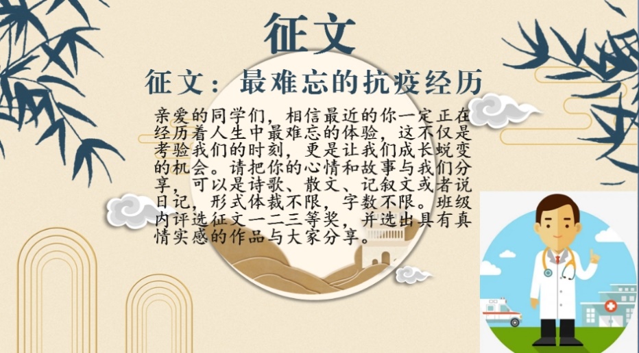 同时,她还发起线上语文征文活动《最难忘的抗疫经历》,鼓励学生积极表达情绪、记录生活。在班级内评选优秀作品一二三等奖,并选出具有真情实感的作品与大家分享。