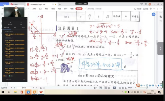 本节课公开课的学习任务为《任意角的三角比》,为保证线上线下的同时开展,董老师在课前五分钟做好电脑、手写板等相关设备的调试并开启钉钉直播等待学生进入课堂,提醒学生做好上课物品的准备,线上学生观看共享课堂,在授课过程中,严格把握BOPPPS六个授课环节,从学生已知的锐角三角函数作为导入,激发学生学习兴趣,由浅入深引入任意角的三角函数,采用任务驱动法、启发式教学法、问题教学法等,借助手写板在屏幕上书写详细板书方便学生理解掌握课堂内容,同时董老师与线下学生在课堂中开启视频,让线上学生也能更好的融入课堂感受课堂,同时借助多媒体设备与学生连麦一对一回答问题,更好地展现了学生为主体的教学模式。