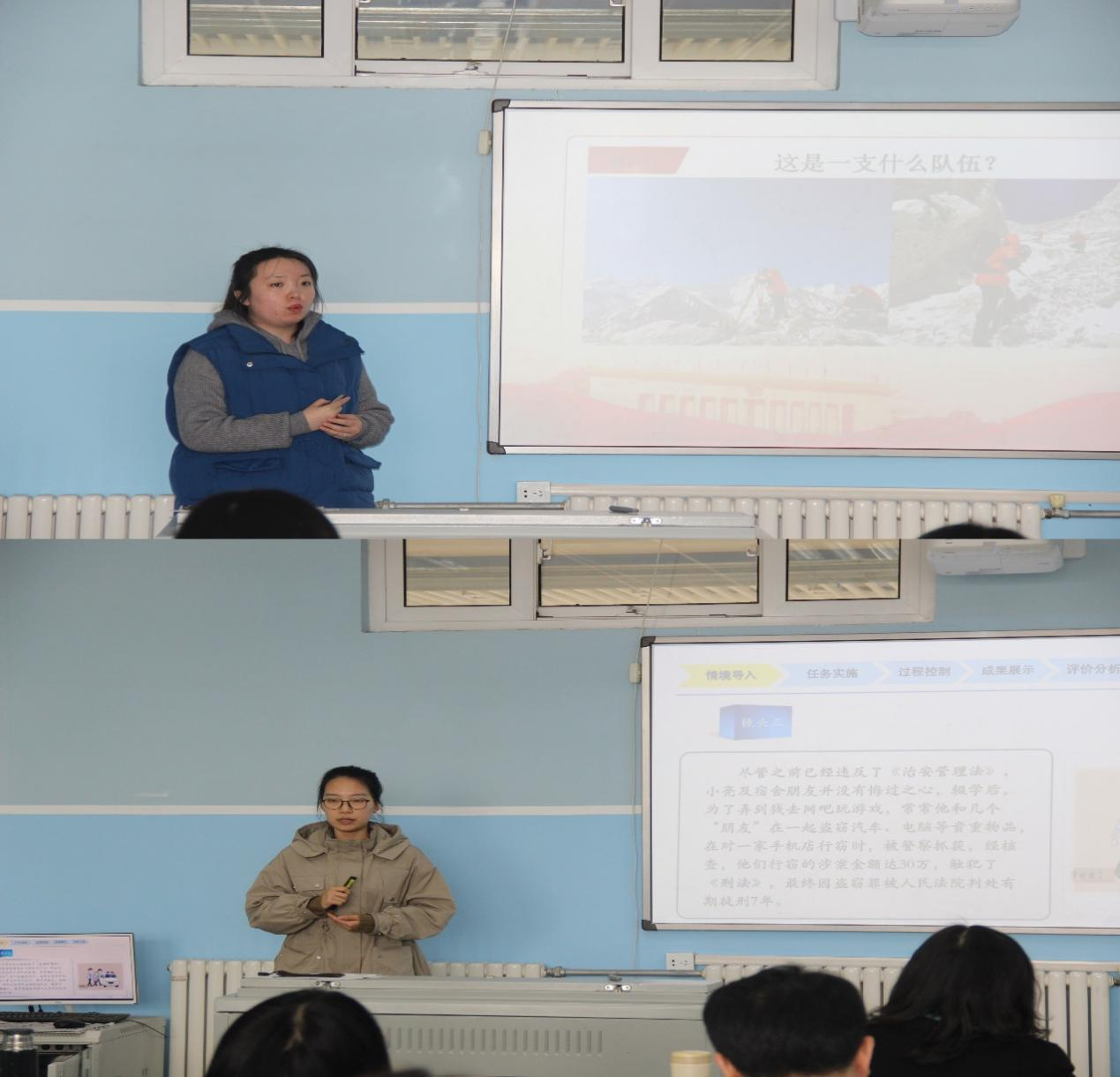 作为新教师代表,于淏琳和王旭分别围绕《学习道德模范,感动更要行动》和《预防未成年人犯罪》两个主题,展开15分钟试讲展示。在座的各位结对指导教师、教研室主任分别从教学内容安排、教学环节设置、教姿教态等方面对两位新教师的试讲进行了详细的点评。侯鸿雁提出,课程教学要将思政元素、通用职业素养与学生的专业知识相融合,充分发挥学生的主体性作用,最终回归学生本身,引起学生的共鸣,引导学生知行合一。