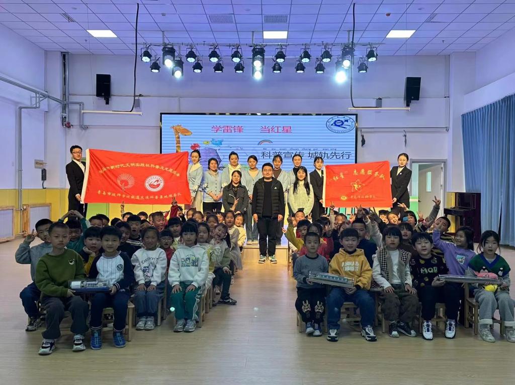 3月21日上午,轨道交通学院团总支书记黄有成老师带领青岛市新时代文明实践社科普及志愿者青岛市技师学院轨道交通学院科普基地服务队3名志愿者(苏瑞安、董文静、唐晓静)第二站来到了即墨区通济岘山幼儿园,为该园60名大班小朋友、尹红艳园长和老师们开展了一期以“学雷锋 当红星|科普宣传 城轨先行”为主题的科普宣讲。
