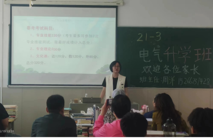 本次家长会分别由班主任周洋、董雪和卢进主持,邀请于维霞老师、王静老师等任课教师参加,主要从班级基本情况、春考政策解读、学院日常管理、月考成绩分析、下一步工作计划、学院招生宣传、家校沟通交流等几个方面进行,让家长了解职教高考政策,做到心中有数,帮助家长们全面把握学生现阶段的学习、生活和学校表现情况,配合协助班主任、任课教师做好学生工作,针对家长提出的意见或建议进行认真分析并上报学院相关部门,实现家校协同育人,共同促进学生的全面发展。