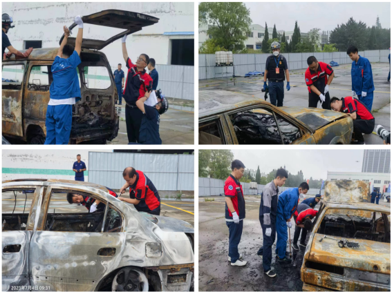 比武当天正值大雨倾盆,汽车技术学院师生提前一小时到场,他们穿上雨衣协助消防部门搬运比赛后勤保障物资。此次火灾调查大比武以汽车火灾事故为比赛项目,涉及16辆不同类型、不同程度烧毁的车辆。消防员通过勘察现场、收集火灾有关证据线索,分析火灾发生发展过程,同时需要汽车技术专业人员配合拆卸车辆部件,整个比武过程共计3个小时。汽车技术学院16组师生站在规定区域,根据比武人员要求拆卸烧毁汽车的相应部件,为他们更准确的判断提供技术支持。