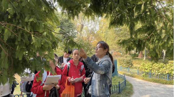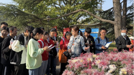 授课过程中,授课教师不仅讲解了植物分类的基础知识,还对不同植物类群的特点和代表树种进行了详细阐述,使同学们对植物的认知有了更深入的理解。任课教师还特别就中山公园举办的菊花展展开了专题讲解。从菊花的起源、演进、种类到培育方式,同学们都听得津津有味,对这种美丽的花卉有了更全面的了解。在实地观察学习中,同学们认真地辨认着老师讲授的植物,细心观察它们的形态特征,做好笔记。