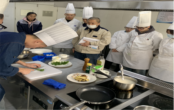 本节课从课前准备、课前学习检测、发布工作任务、制定工作方案、整改工作方案、教师讲解示范、实施工作任务、总结评价、课后拓展等环节展开实践教学,完整地呈现了一堂"工学一体化"教学示范课。学生课堂反应积极,教学效果较好。课后,烹饪教研室主任谢洪山组织听课教师进行评课,针对教学过程中的不足之处、课堂教学的设计优化、学生评价多元引领等方面提出了行之有效的建议。