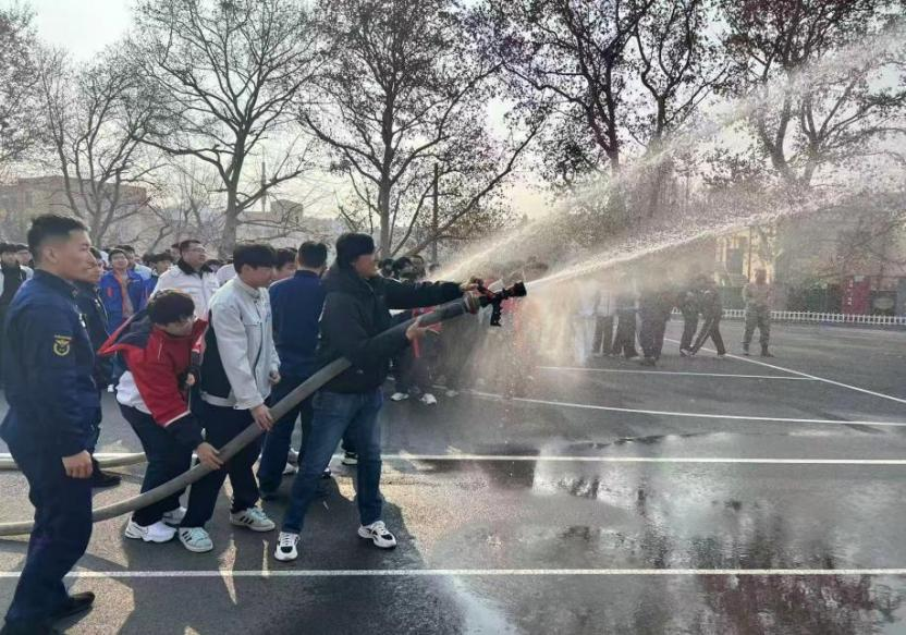 随后,消防特勤大队张璐琛队长为师生科普消防知识,着重强调冬季防火注意事项,讲解消防车结构与工具功能,示范干粉灭火器、消防水枪器材使用技巧,并指导大家完成实战灭火演练。