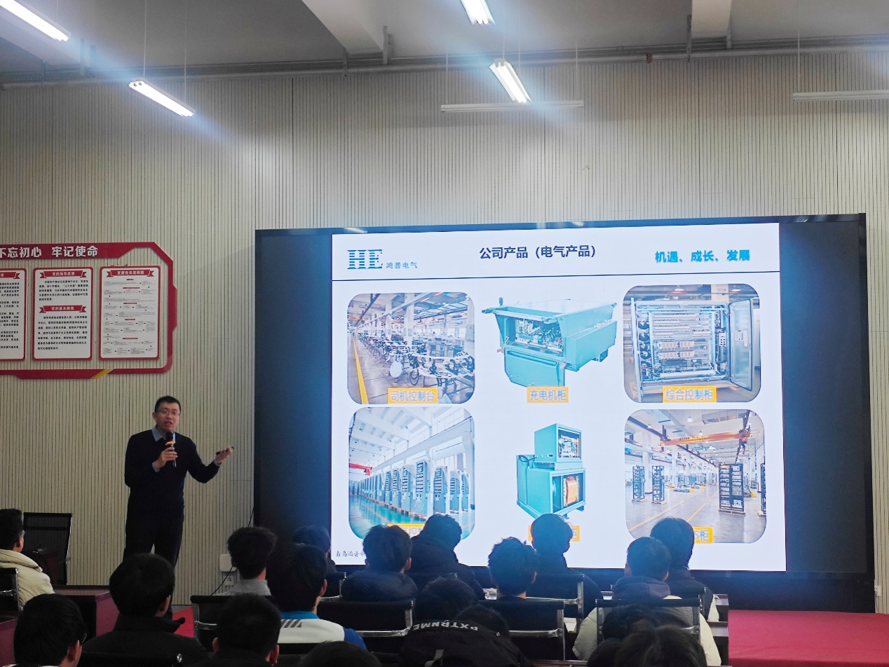 为搭建校园与企业的沟通桥梁,帮助学生明晰行业发展趋势、找准职业定位,12 月 16 日下午,智能制造学院邀请青岛鸿普电气科技有限公司党支部书记、副总经理徐建,开展“引燃改变,做更好的自己”职业指导规划主题讲座。智能制造学院25级大学生技师班、鸿普电气订单班学生以及马克思主义学院部分教师代表参加活动,沉浸式汲取行业智慧与经验。