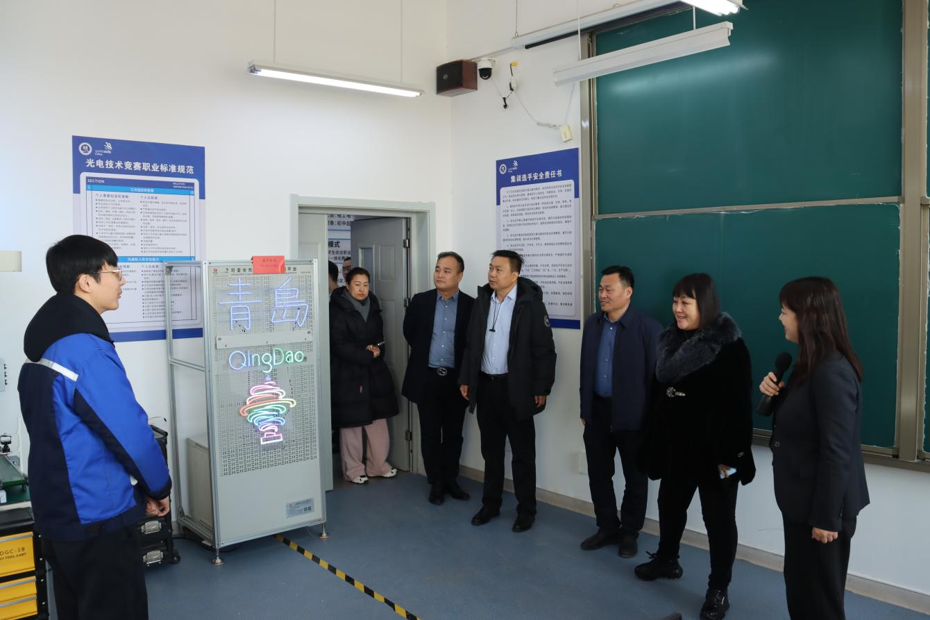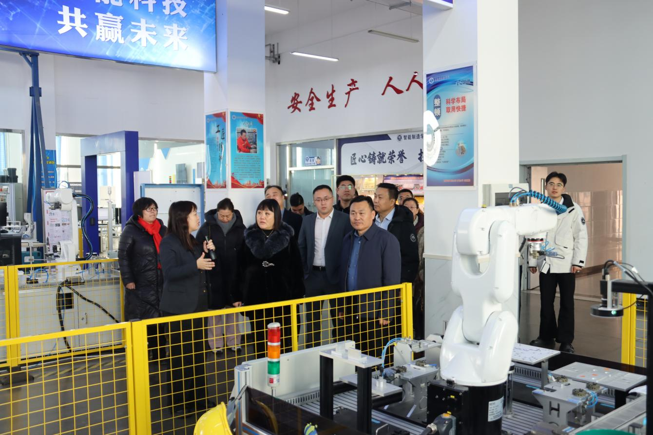 王旭红一行实地走访参观了智能制造学院产教融合实训基地与第47、48届世界技能大赛光电技术项目中国集训基地,通过实地观摩,详细了解了学院的设施建设、教学实训模式及技术成果转化情况,对学院“竞赛引领·岗课赛证融通”的技能人才培养模式给予高度认可。