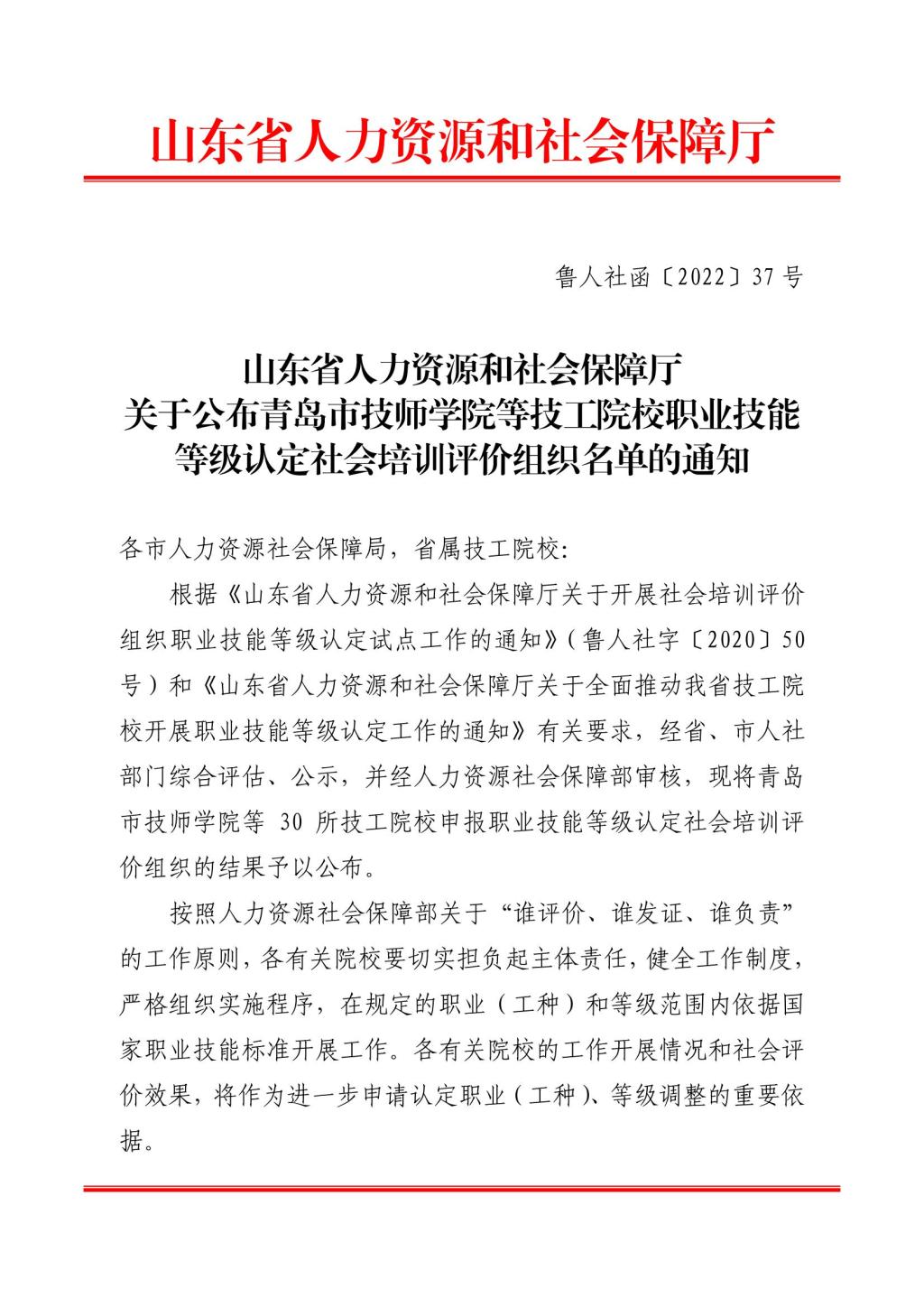 上一条: 青岛市技师学院关于开展职业技能等级认定工作的通知 下一条: 山东省人力资源和社会保障厅关于公布青岛市技师学院等技工院校职业技能等级认定社...