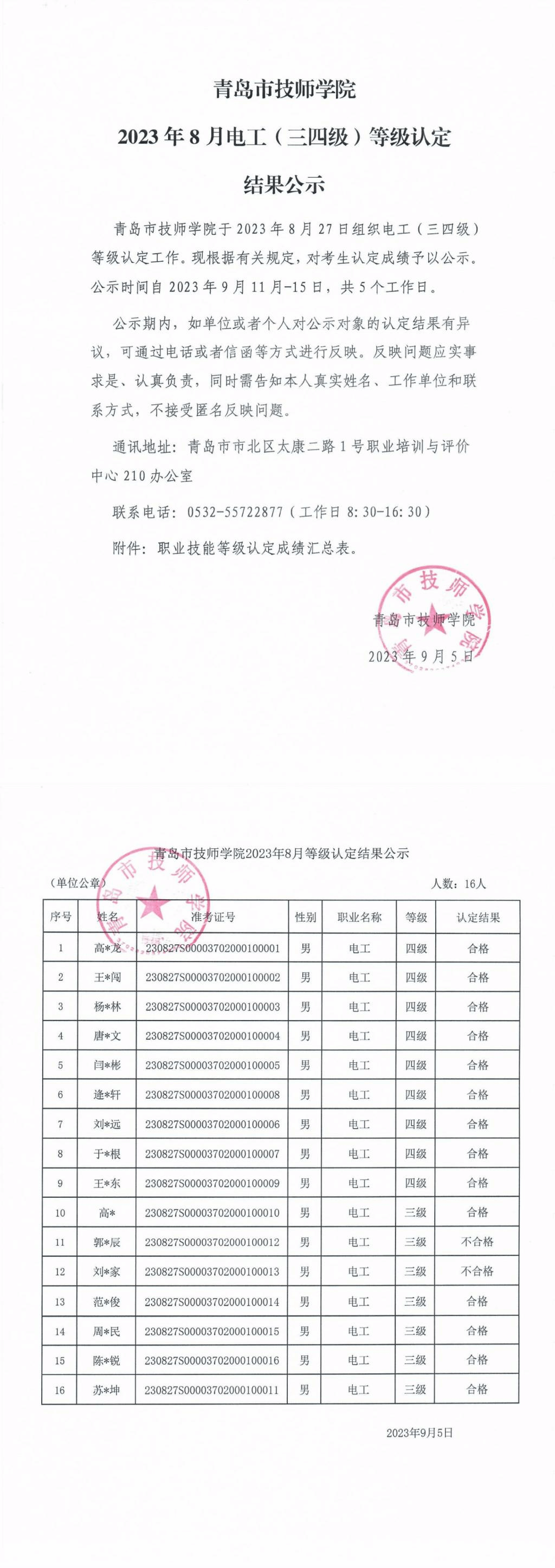 上一条: 2023年8月茶艺师(五级)等级认定结果公示 下一条: 2023年8月中式面点师、钳工(五级)等级认定结果公示